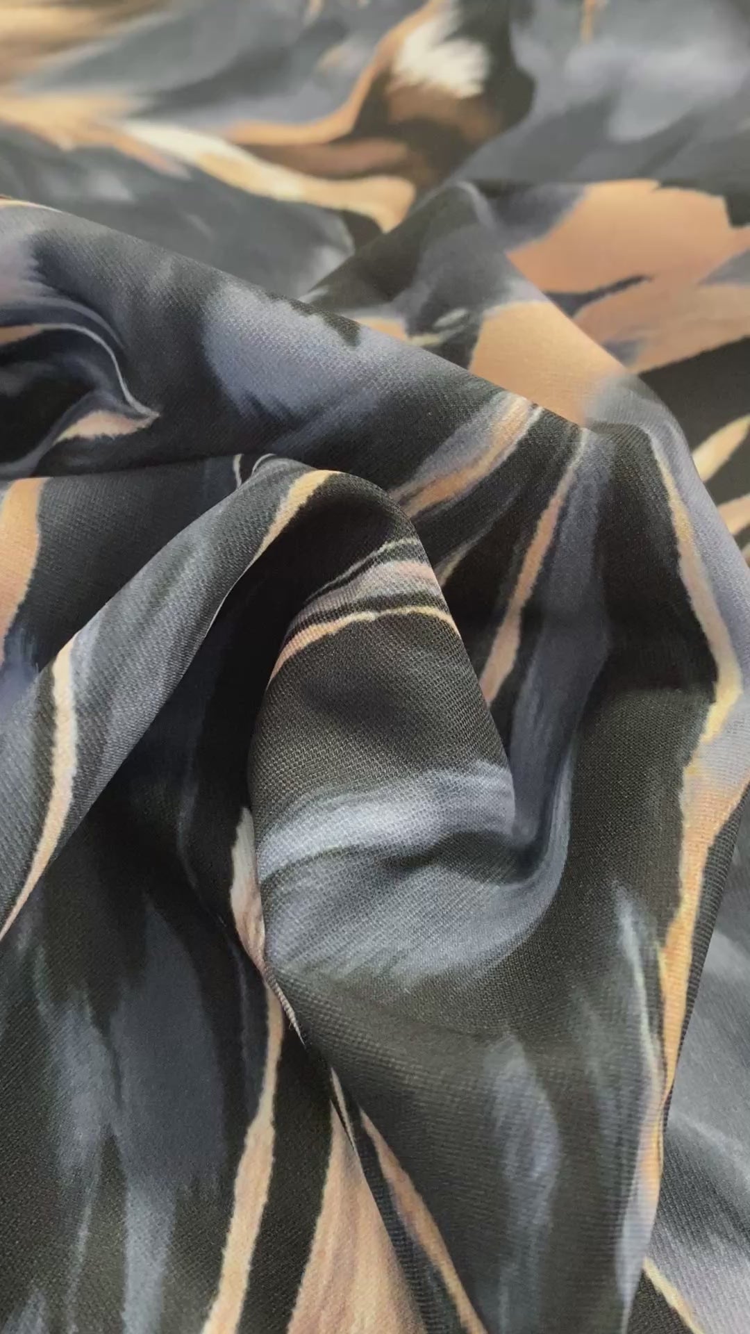 Abstract Feather Pattern Fabric in Black, Beige, and Blue – Custom Printed Fabric on Satin, Crepe, Spandex or Chiffon