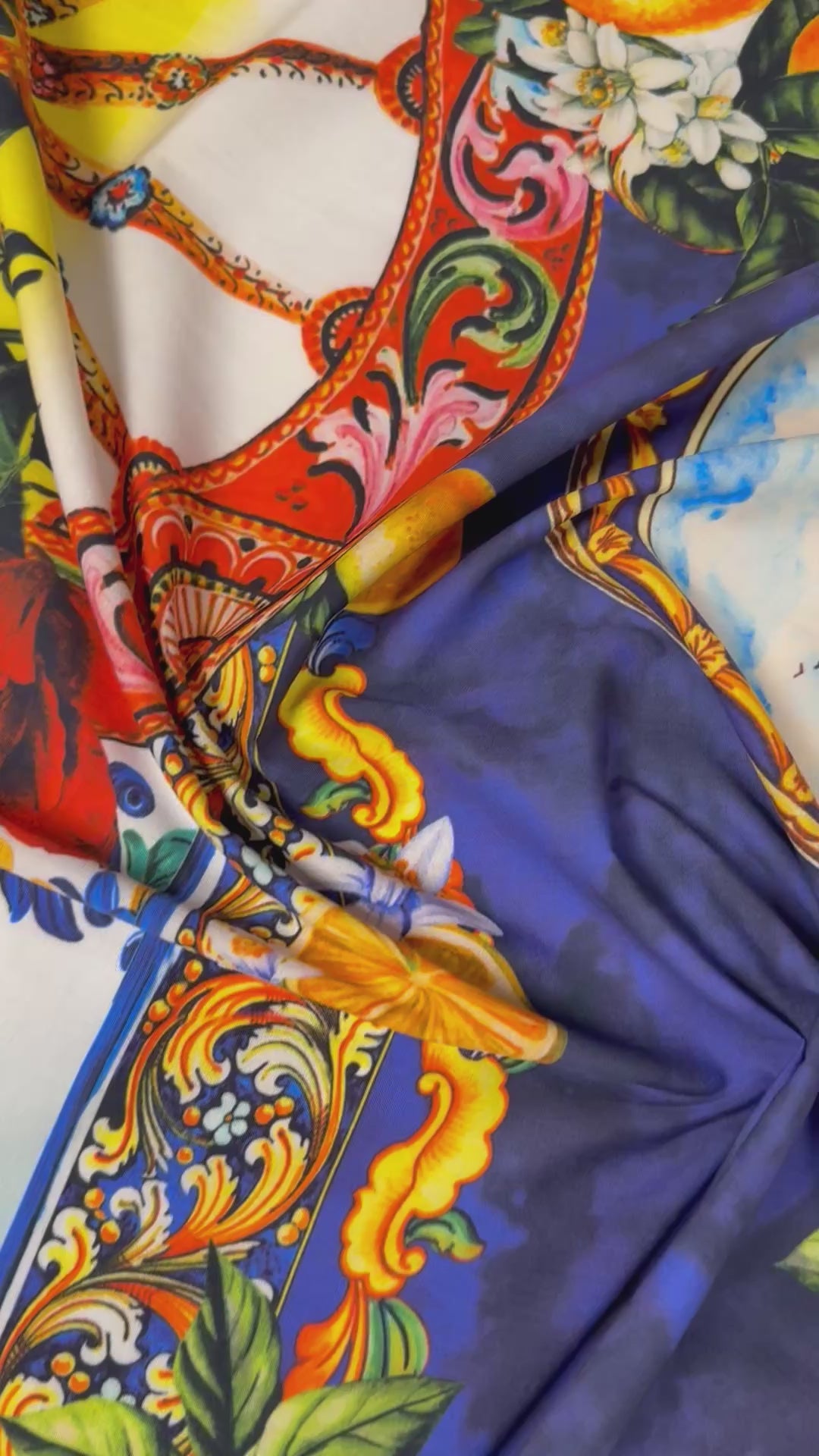 Opulent baroque florals with citrus accents on organic cotton poplin. 150cm width – a striking choice for dresses, skirts and occasion wear.