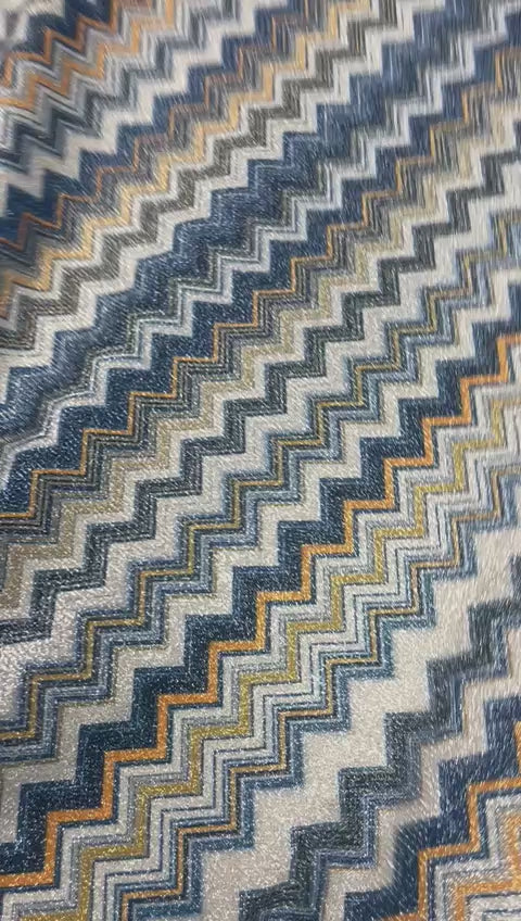 This Lurex glitter fabric features a vibrant blue and orange zigzag pattern, perfect for adding style and durability to your creative projects. Crafted from premium 4-way stretch spandex, this shimmering craft fabric measures 150 cm (59.04 inches or 1.64 yards) wide, offering excellent elasticity and comfort for garments and crafts alike. Whether you need fabric for activewear, dancewear, or decorative textiles, this glitter lurex material delivers eye-catching sparkle combined with lasting strength.