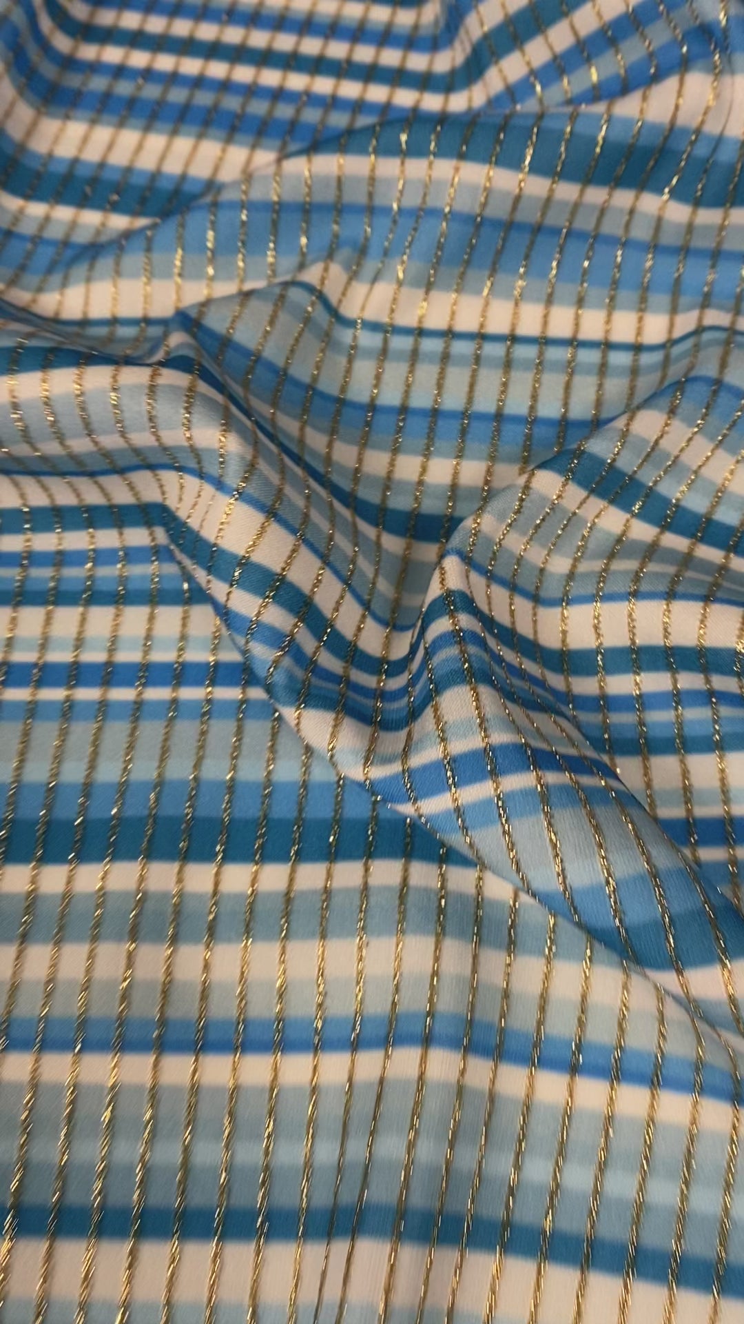 The Blue Striped Shimmer Ottoman Fabric is a premium blue shimmer fabric designed to elevate your creative projects with sparkle, stretch, and comfort. This versatile fabric for dancewear and activewear material features a glitter pinstripe fabric pattern with elegant gold lurex stripes that catch the light beautifully. Measuring 150 cm (59.04 inches) wide, this soft color ottoman fabric provides ample width for large seamless projects like leotards, leggings, dresses, swimwear, and athleisure fabric designs. Its 4-way stretch material allows unrestricted movement and a comfortable fit, making it ideal for performers and casual wearers alike.