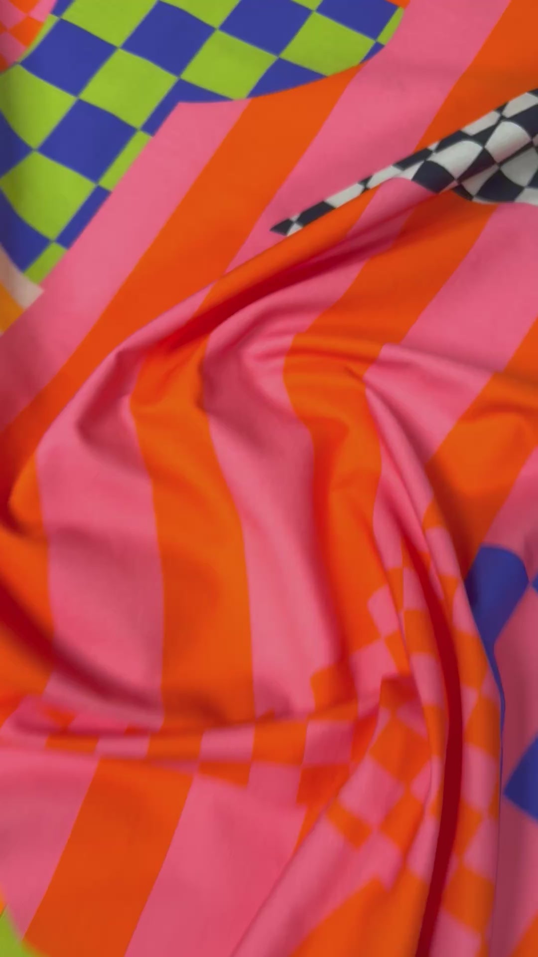High‑impact checkerboard and colour‑block geometric on organic cotton poplin. Comfortable, breathable and great for shirts, dresses and kidswear.