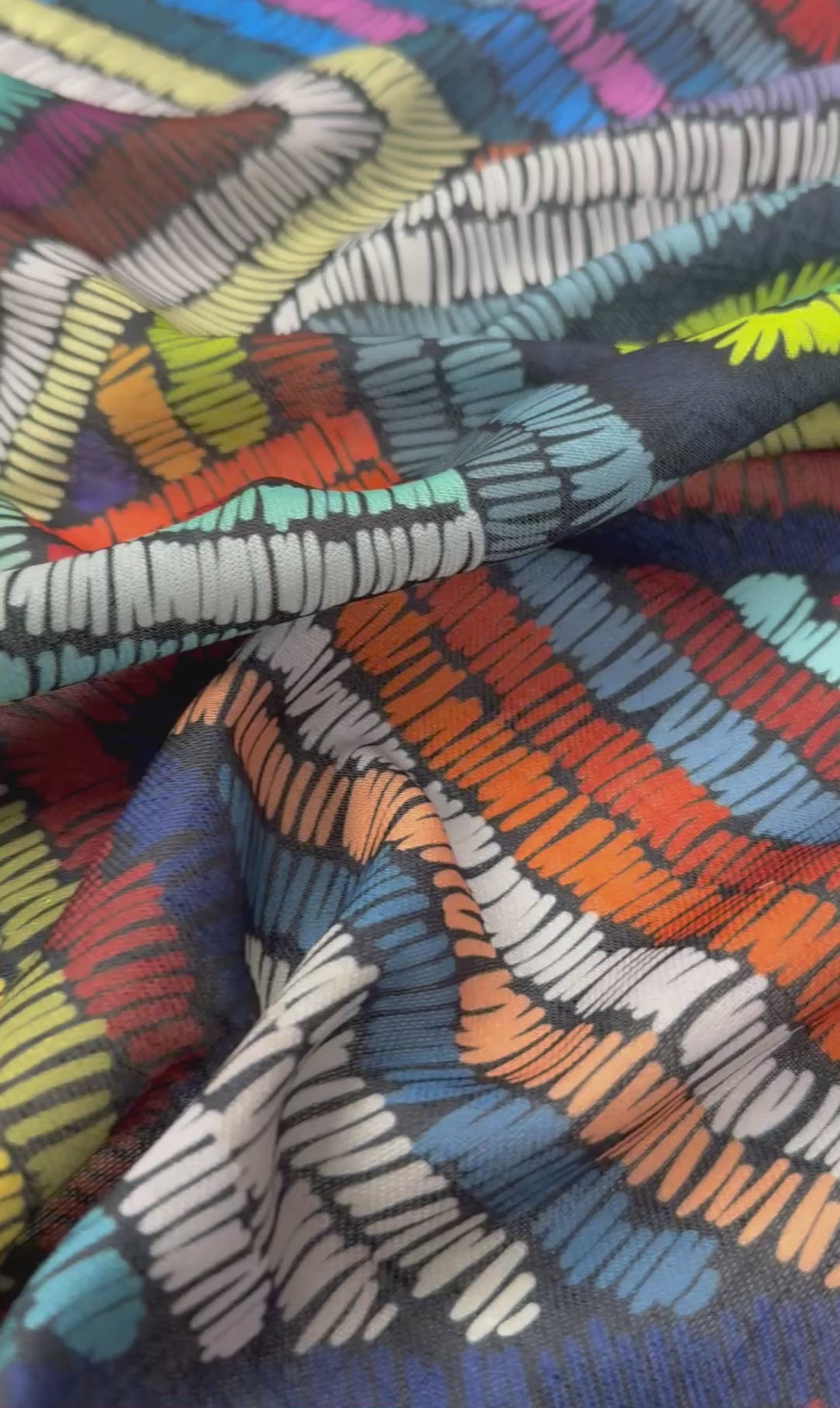 Vibrant geometric print linen fabric with a soft, breathable texture. Perfect for dresses, shirts, skirts, crafts and home sewing projects with a natural feel. Sold by the metre.