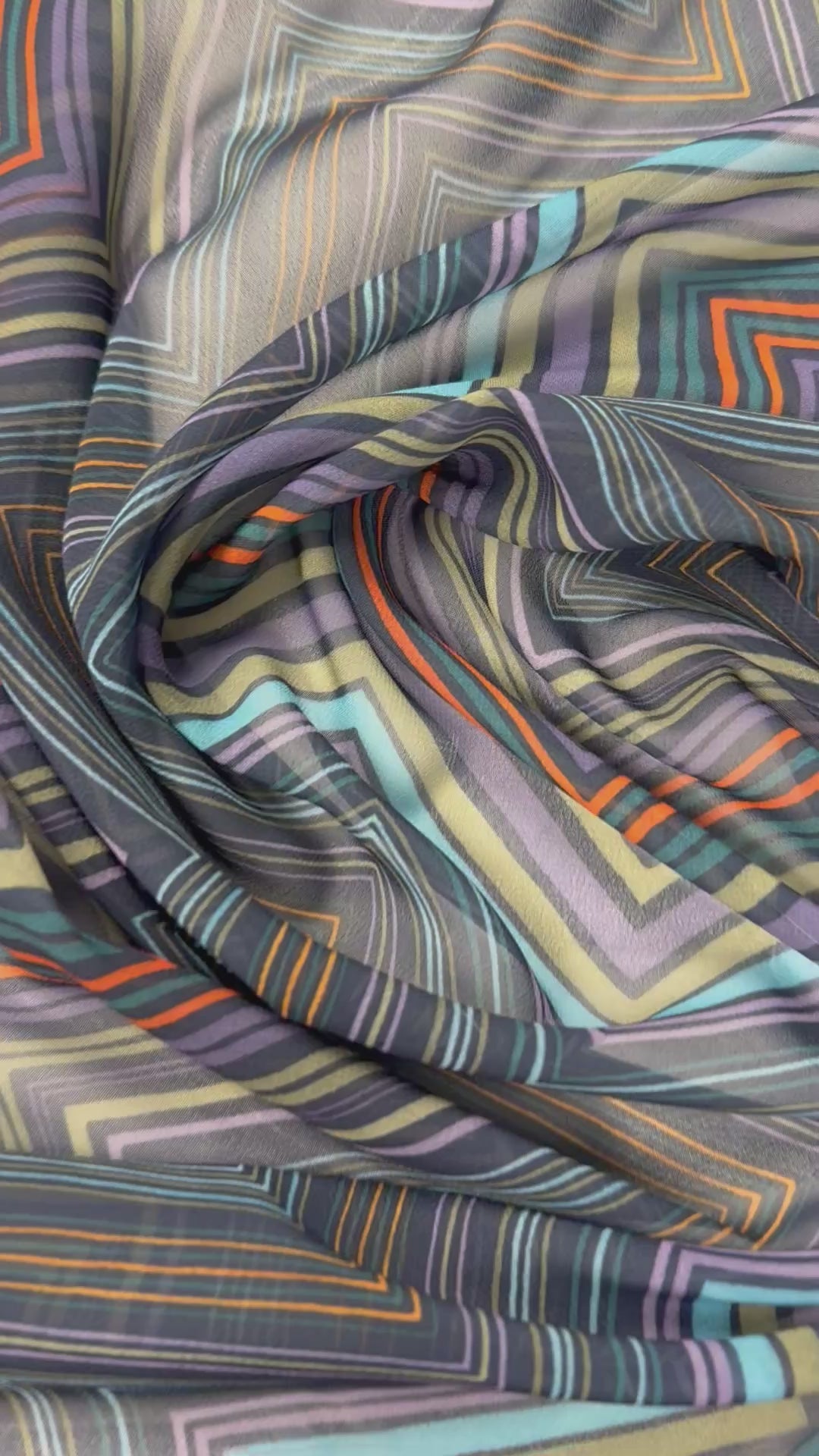 Vibrant multicolour zigzag print fabric with a smooth, flowing drape. Ideal for dresses, blouses, skirts and creative sewing projects with a bold modern look.