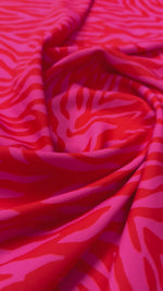 Vibrant red and pink zebra print crepe fabric with a smooth, soft drape. Perfect for dresses, blouses, skirts, and standout fashion projects. Sold by the Metre.