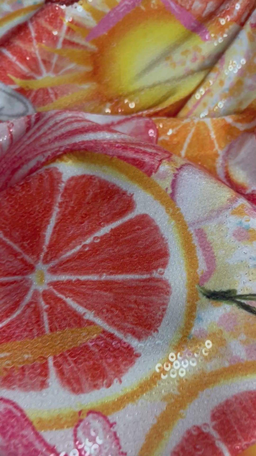 Our Tropical Citrus Sequin Fabric is a premium sequin stretch fabric designed to bring vibrant style and comfort to your fashion projects. This sequin stretch fabric features bright orange, yellow, and red citrus slices paired with a charming red pink starfish pattern, making it perfect for creating eye-catching evening dress fabric, dance costume fabric, and other form fitting fabric needs. The 2 way stretch material offers excellent flexibility, allowing freedom of movement without sacrificing fit or style.
