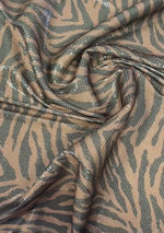 Bold brown tiger animal print fabric with subtle sequins and a soft drape. Ideal for statement dresses, tops, skirts, party outfits and creative sewing projects.