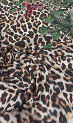 Lightweight crepe fabric with a bold jungle animal print featuring leopard spots and tropical details. Perfect for dresses, blouses and flowing garments. Sold by the metre.