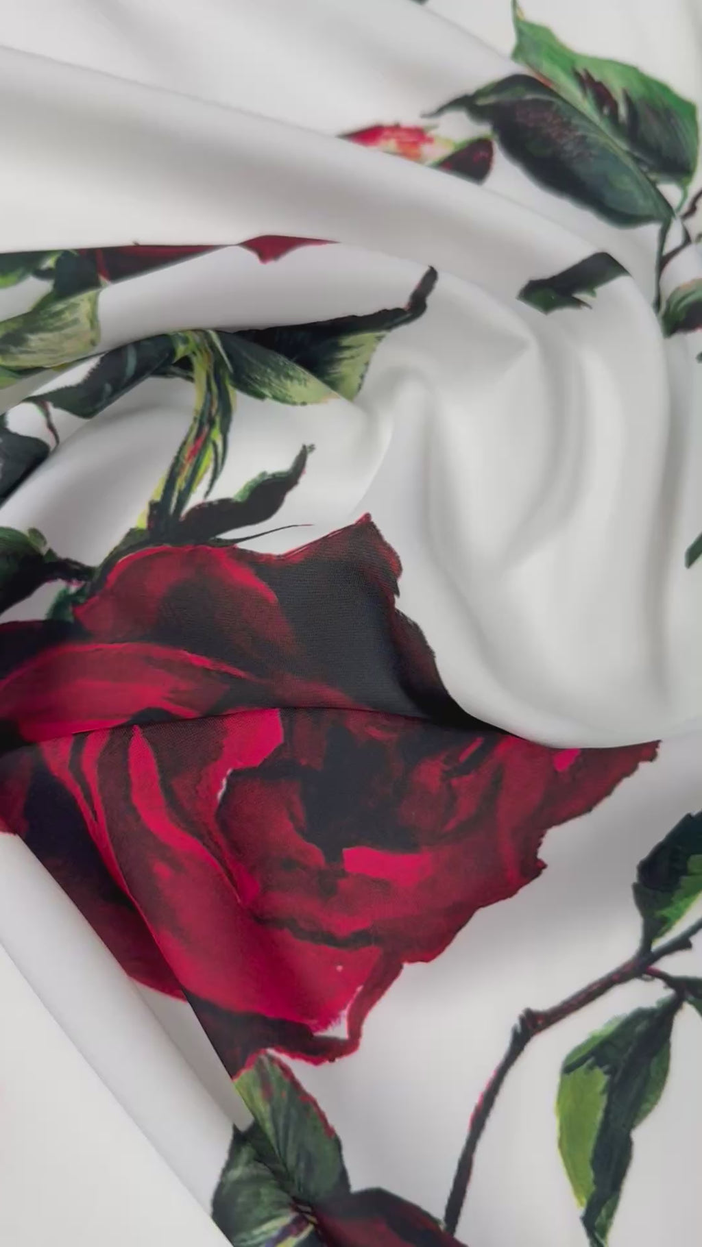Soft crepe fabric with an elegant red rose print on a light background. Ideal for dresses, blouses and feminine garments with a graceful drape. Sold by the metre.