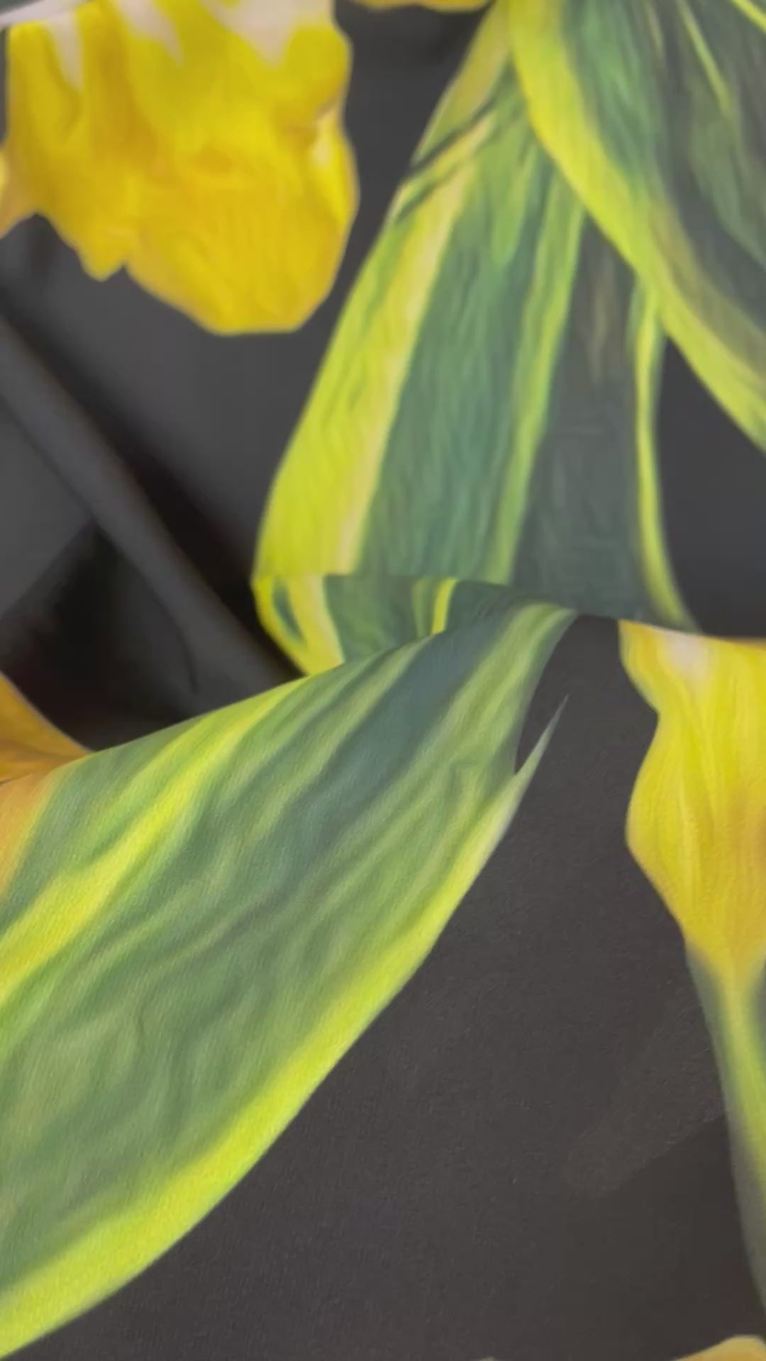 Introducing our elegant yellow tulip floral print fabric, set against a striking black background. This fabric features a beautiful floral design that adds a touch of sophistication to any project. Ideal for various applications, it is perfect for crafting, sewing, or home decor. Enjoy the vibrant colors and quality material that make this fabric a standout choice for your creative endeavors.