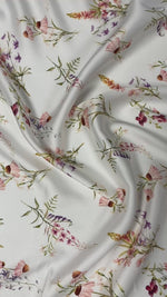 Light cream fabric with delicate pastel flowers. Perfect for spring dresses, blouses, or elegant home decor creations.