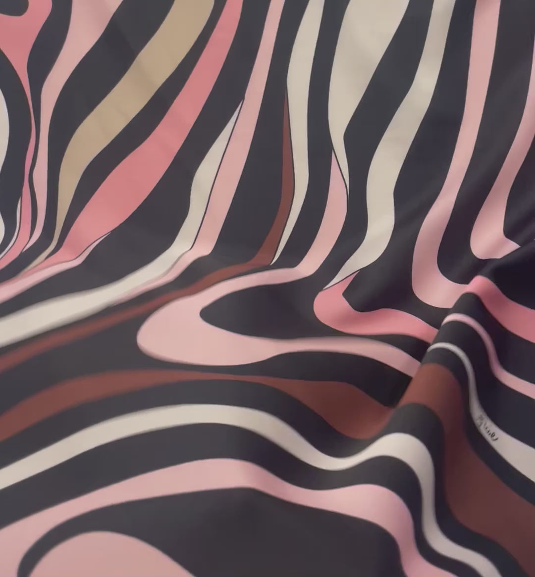 Playful pink and brown swirl print inspired by 70s retro style. Ideal for dresses, blouses, or bold interior projects.