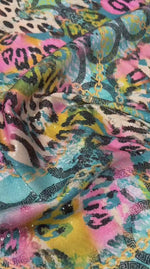 Vibrant multicolour animal and chain print fabric with subtle sequins. Perfect for bold dresses, party outfits, dancewear and statement fashion pieces.