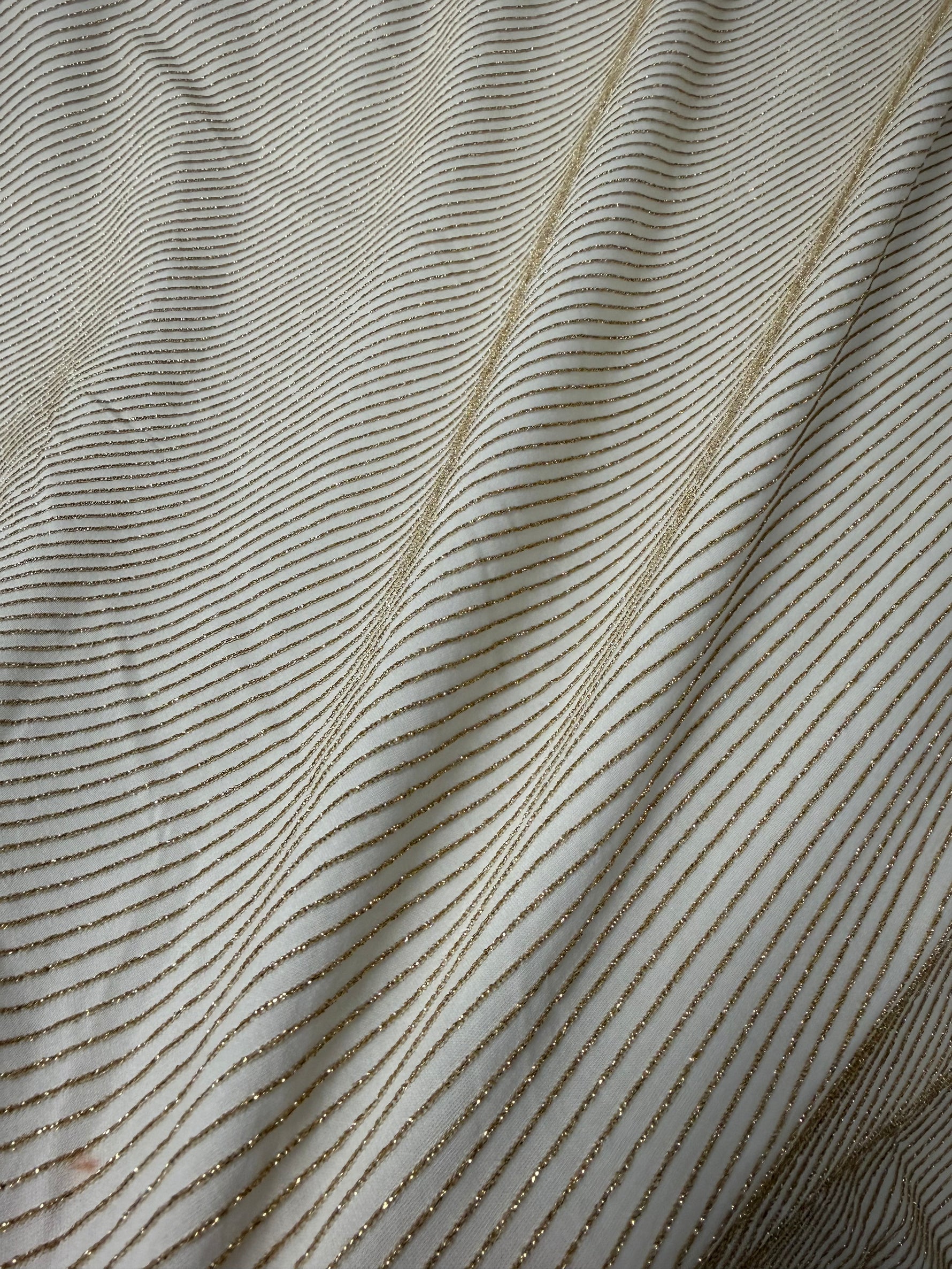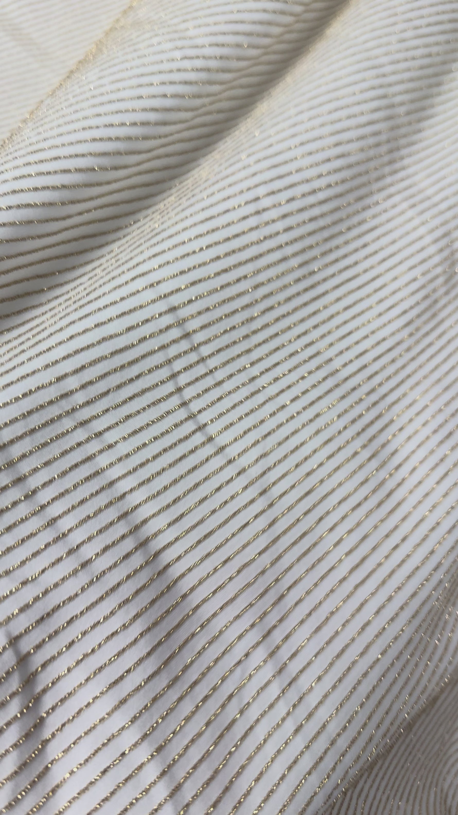 The Shimmer Ottoman in Soft Gold Striped Fabric is a premium soft gold striped fabric designed to deliver exceptional elasticity and a luxurious feel for designers creating sportswear, activewear, swimwear, dancewear, and more. This soft gold striped fabric measures 150 cm wide and combines durability with comfort, allowing garments to move seamlessly with the wearer while maintaining a flattering fit. Crafted from high-quality white jersey spandex textile sourced from Whotex Online Fabric Store, it offers reliable performance and chic appeal. Tested for elasticity retention after multiple wash cycles, this gold shimmer fabric confirms long-lasting performance essential for wearable art.