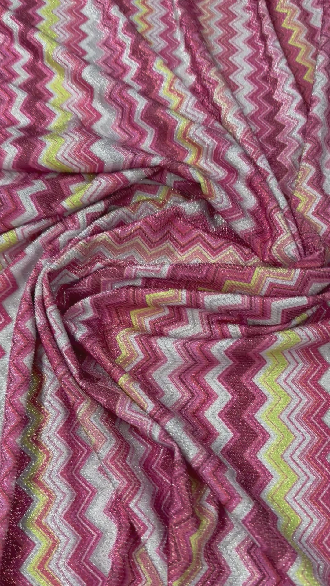 Zigzag Lurex Knit Fabric is a premium metallic shimmer fabric designed to elevate your creations with its unique zigzag pattern fabric and durable polyester fabric base. This stretch knit fabric features advanced 4-way stretch fabric technology, ensuring superior flexibility and comfort for all-day wear. Ideal as a fabric for activewear, dancewear, and fashion garments, it measures 150 cm (59.04 inches) wide, providing ample material for large projects. The anti-allergic fabric properties guarantee safety and comfort for sensitive skin, while the lurex fabric gold threads woven throughout create a subtle yet striking shimmer that enhances any design.