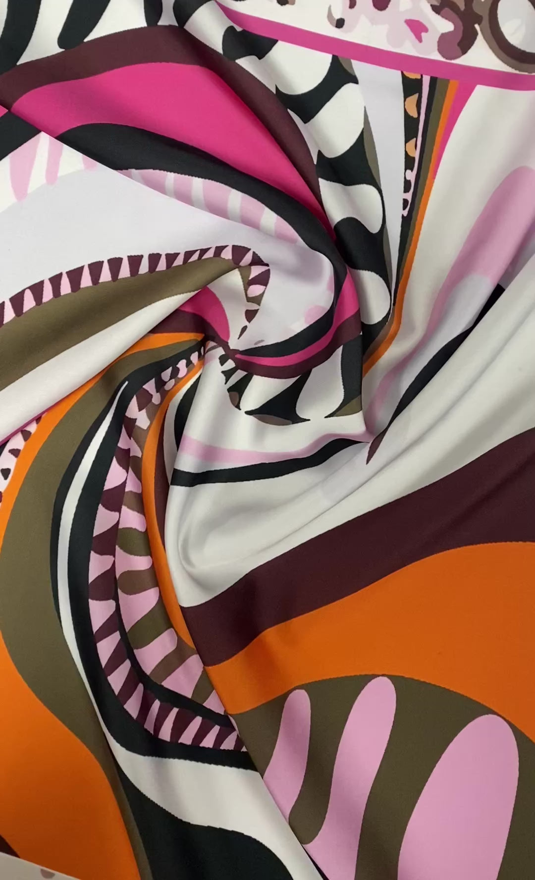 Vibrant abstract fabric in pink, orange, and brown tones. Perfect for statement dresses, scarves, or bold interior decor projects.