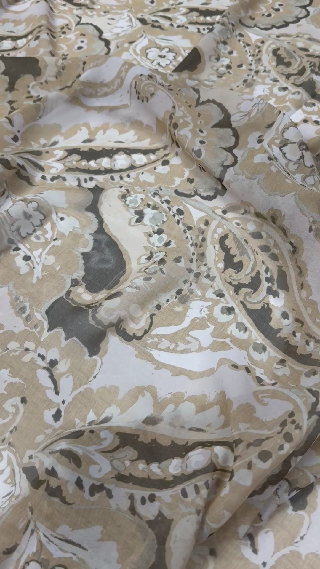 Elegant paisley patterned fabric in soft beige tones with a smooth handle and graceful drape. Ideal for dresses, skirts, blouses and refined craft projects.