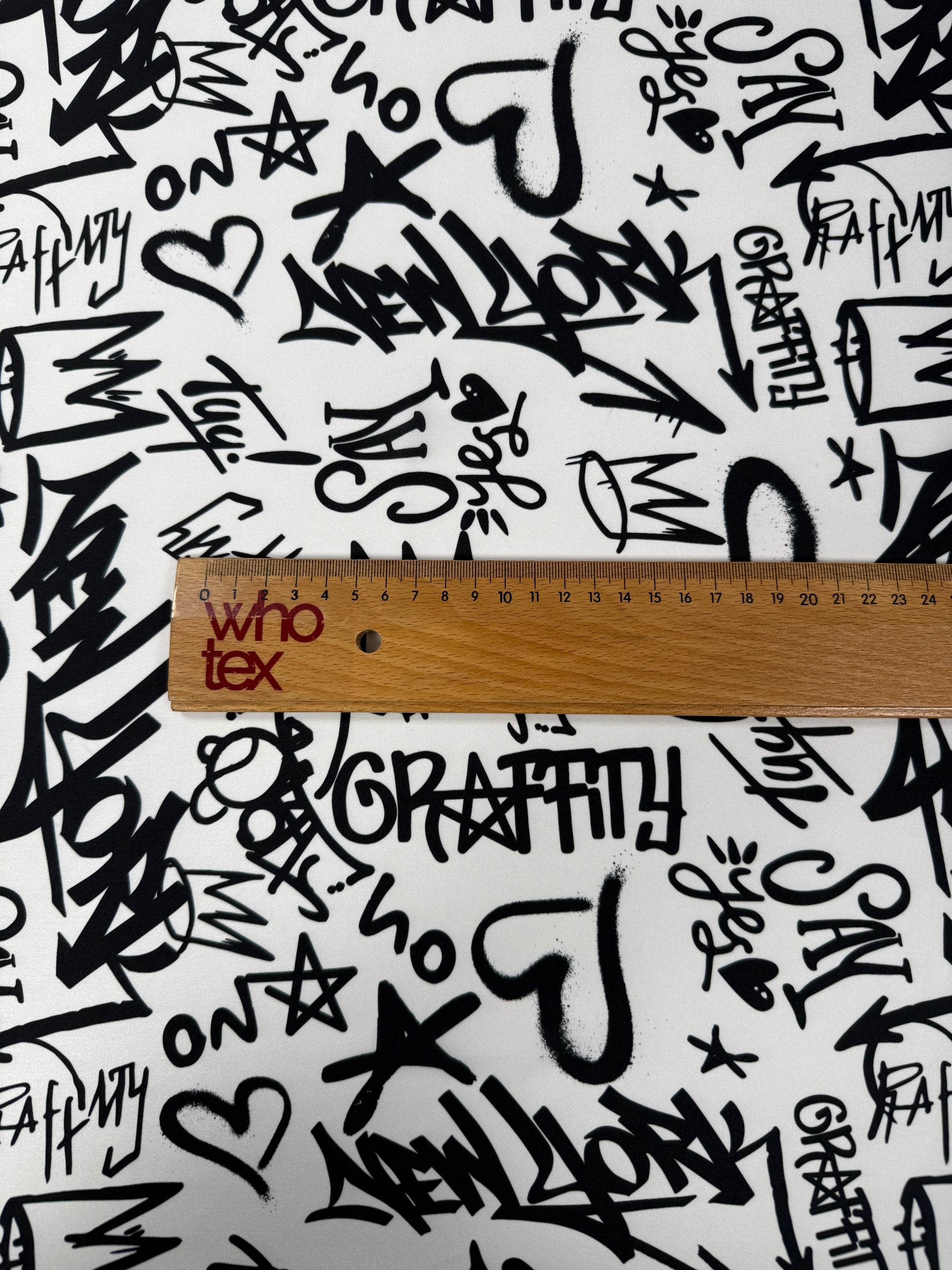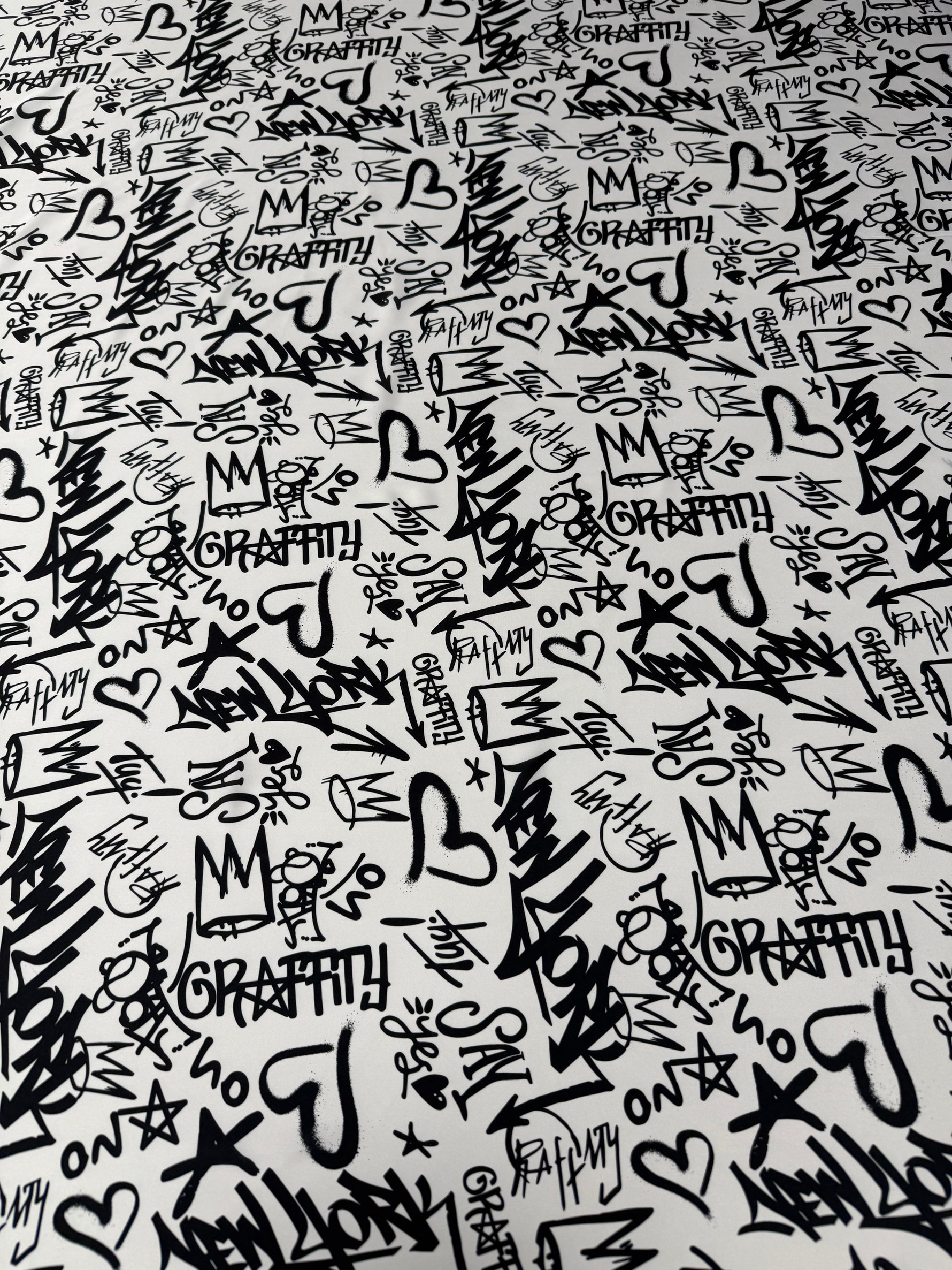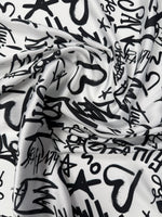 Smooth satin fabric featuring bold black graffiti motifs on a crisp white base. Lightweight, glossy and ideal for dresses, shirts, skirts and creative sewing projects. Sold by the metre.