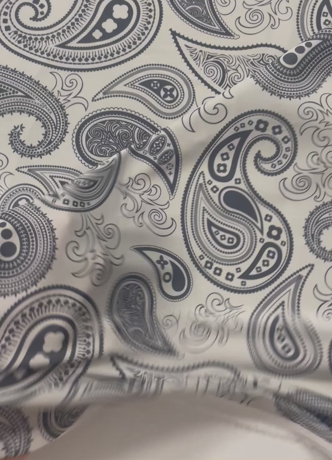 Elegant black and white paisley fabric with fine details. Perfect for dresses, shirts, and interior crafts. Sold by the metre.