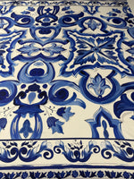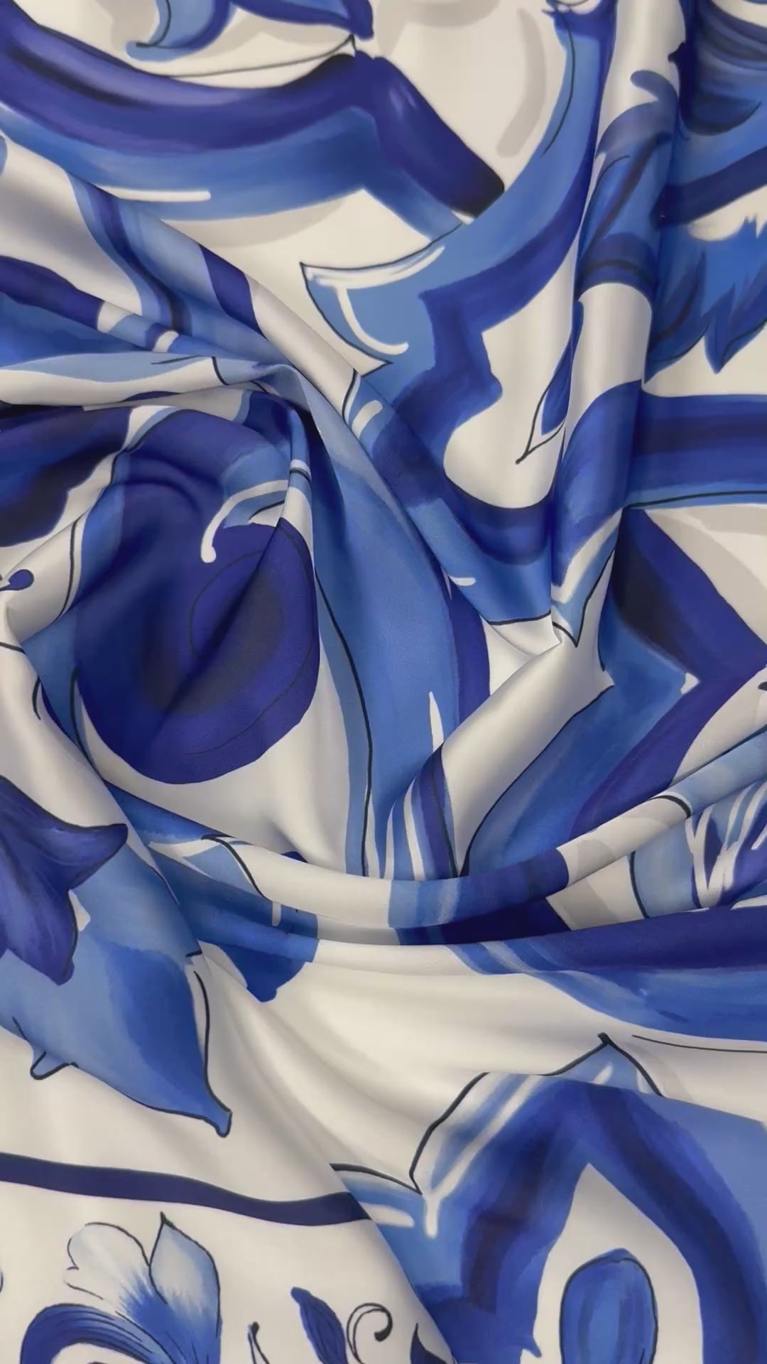 Smooth satin fabric with elegant blue floral and decorative motifs on a crisp white base. Glossy, lightweight and perfect for dresses, blouses, scarves and stylish sewing projects. Sold by the metre.