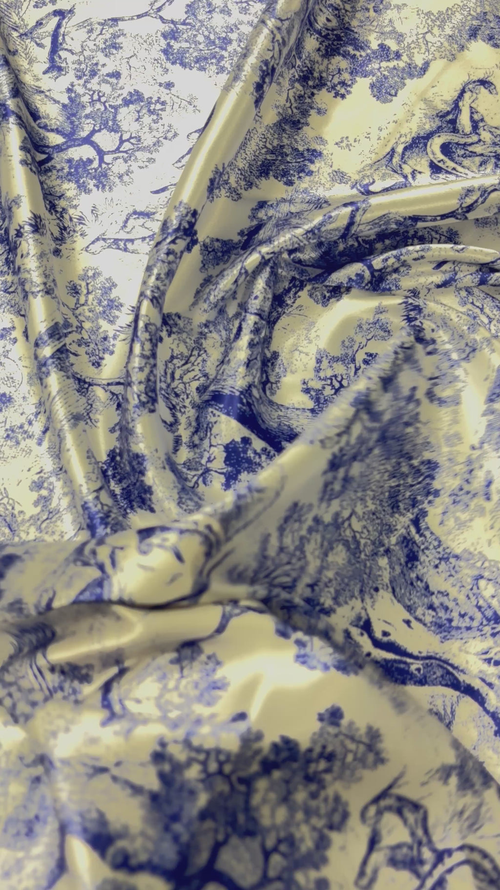 Stretch satin fabric with classic blue toile print, smooth glossy finish and fluid drape. Ideal for dresses, skirts, blouses, nightwear and statement fashion pieces. Sold by the metre.