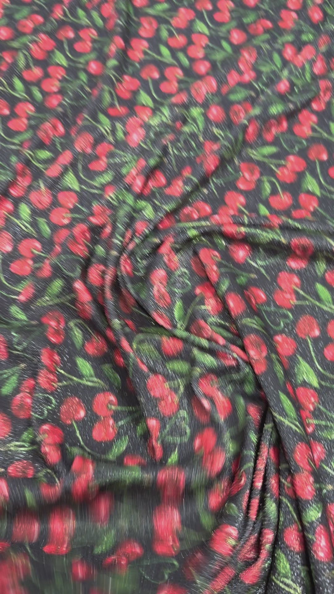 Eye-catching lurex fabric with playful cherry print and subtle shimmer. Ideal for partywear, dresses and statement garments. Lightweight feel with a soft sparkle and flexible comfort. Sold by the Metre.