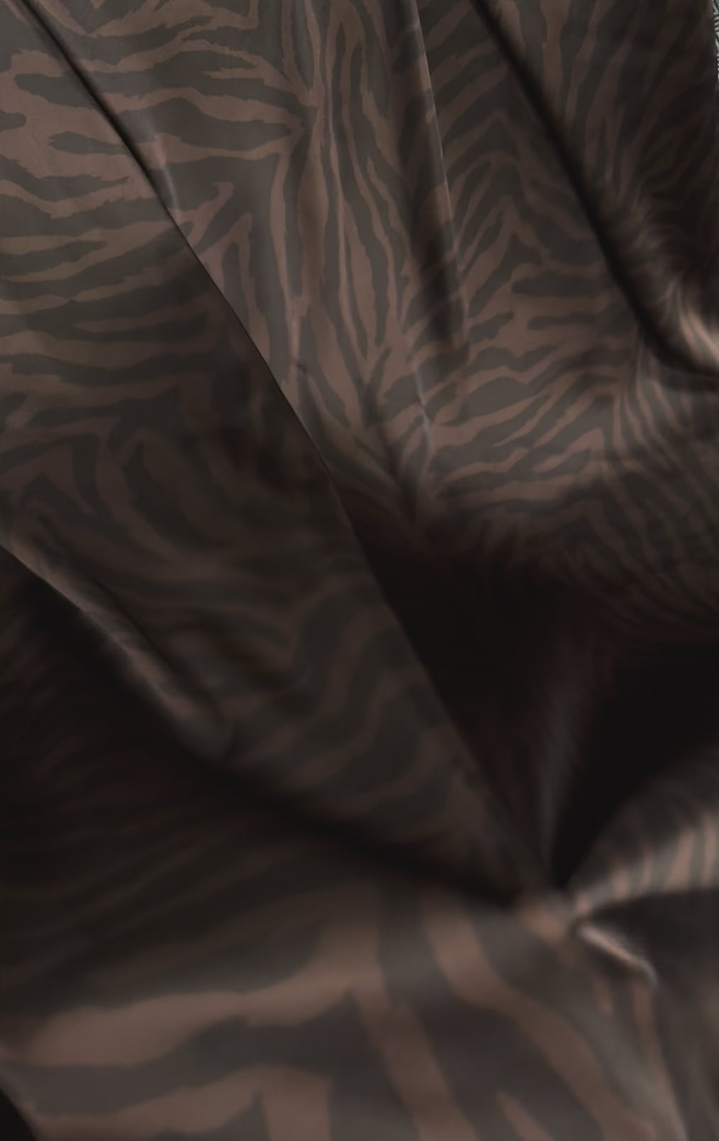 Luxurios deep brown zebra print satin fabric - soft, glossy and stylish. Ideal for dresses, skirts and elegant fashion projects.