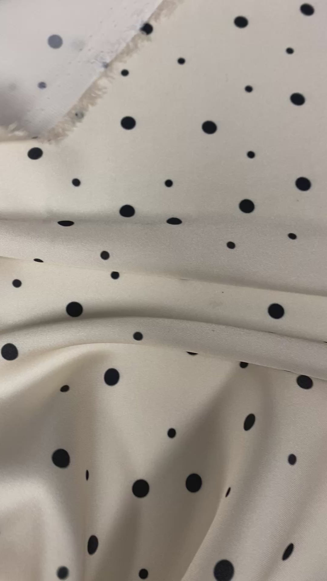 Chic beige fabric with playful black polka dots. Perfect for dresses, blouses, and stylish DIY projects with a timeless look.