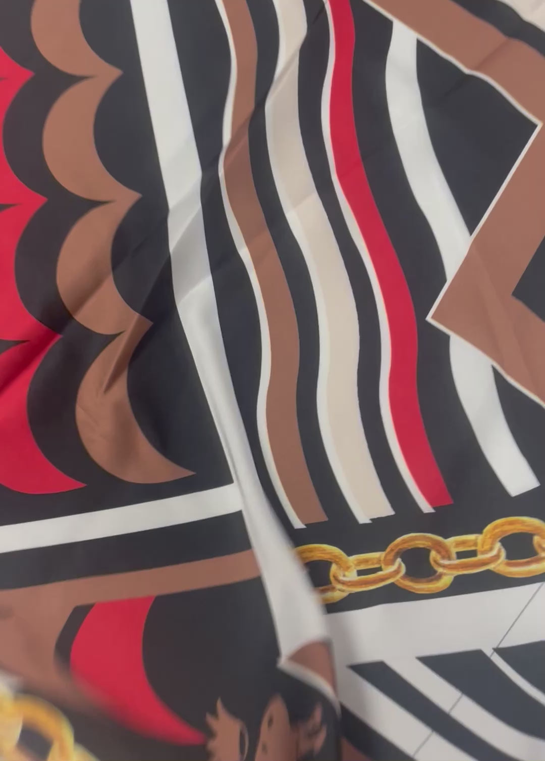 Bold geometric print fabric with brown, red, and black tones, accented with golden chains. Ideal for jackets, scarves, and statement fashion.