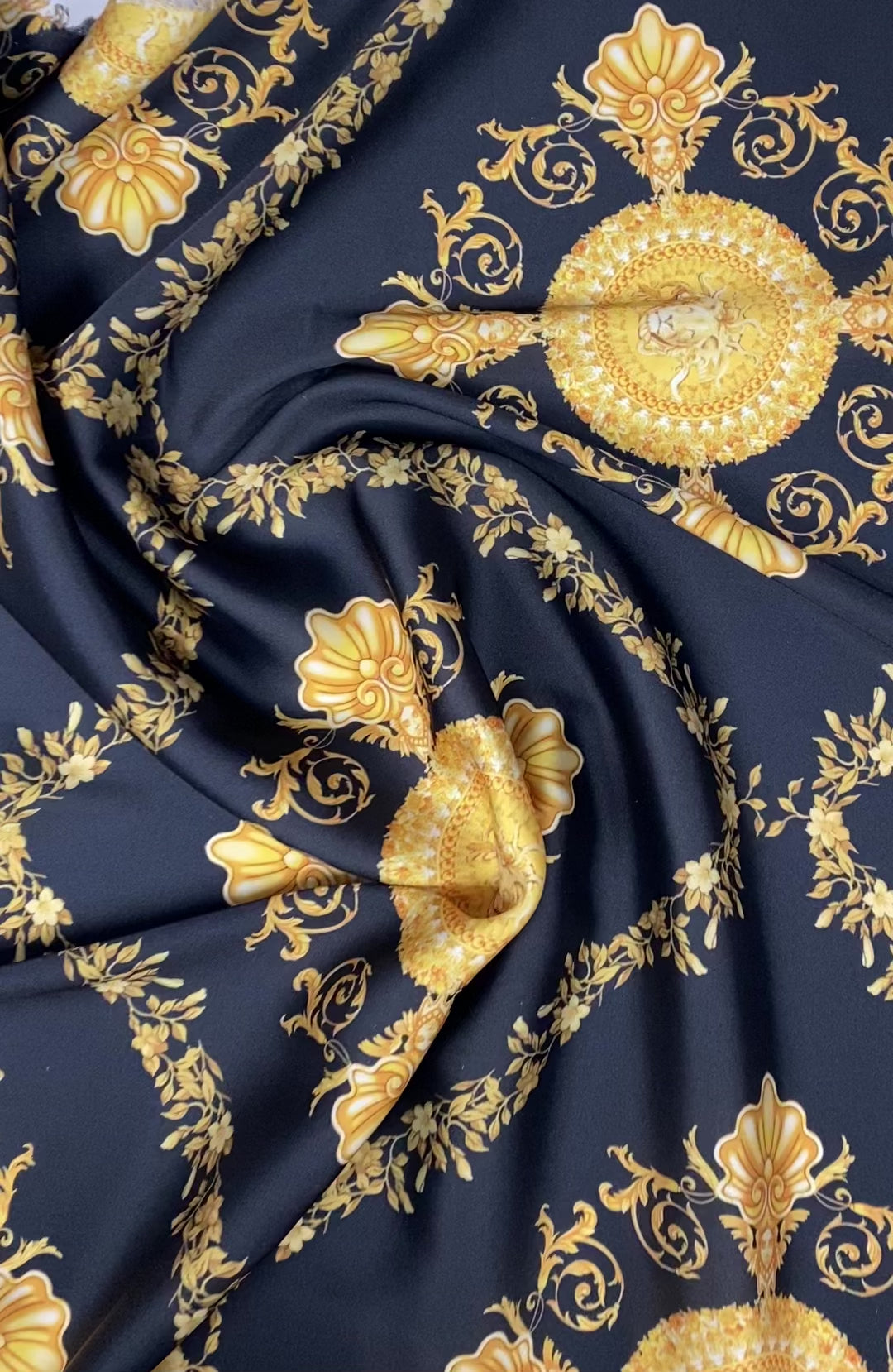 Elegant black fabric with rich gold baroque patterns. Perfect for statement dresses, luxury decor, or bold fashion pieces.