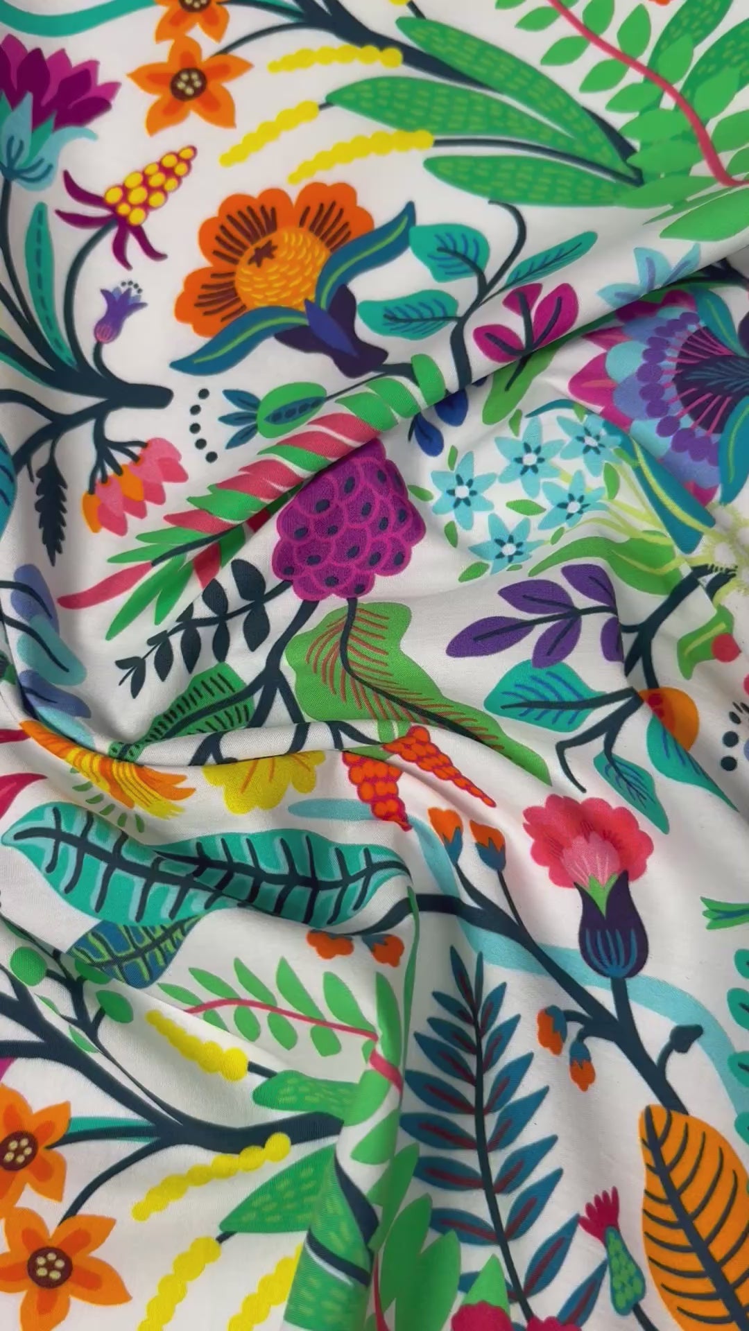 Vibrant folk‑garden floral printed on smooth organic cotton poplin. Cool, breathable and easy to sew – ideal for dresses, blouses and crafts.
