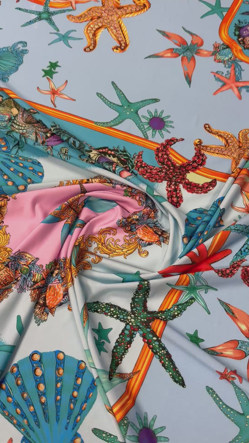 Colourful ocean-themed spandex fabric with starfish, shells and sea motifs. Soft, flexible and durable, ideal for swimwear, activewear, dresses and costumes. Sold by the metre.