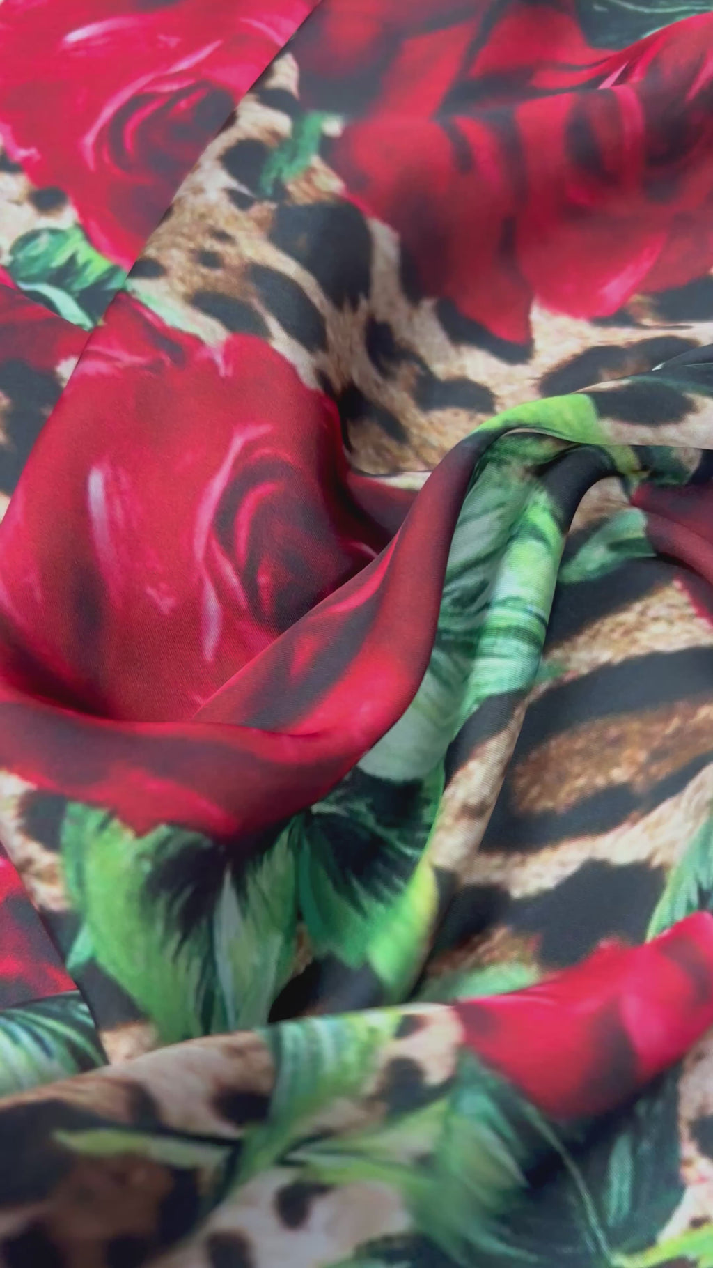 Bold rose and leopard print satin fabric with a smooth, glossy surface. Ideal for dresses, skirts, blouses, occasionwear and striking fashion designs. Sold by the metre.