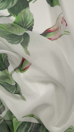 Elegant rose print chiffon fabric with a soft, airy feel and fluid drape. Perfect for dresses, blouses, scarves, occasion wear and delicate fashion projects. Sold by the metre.