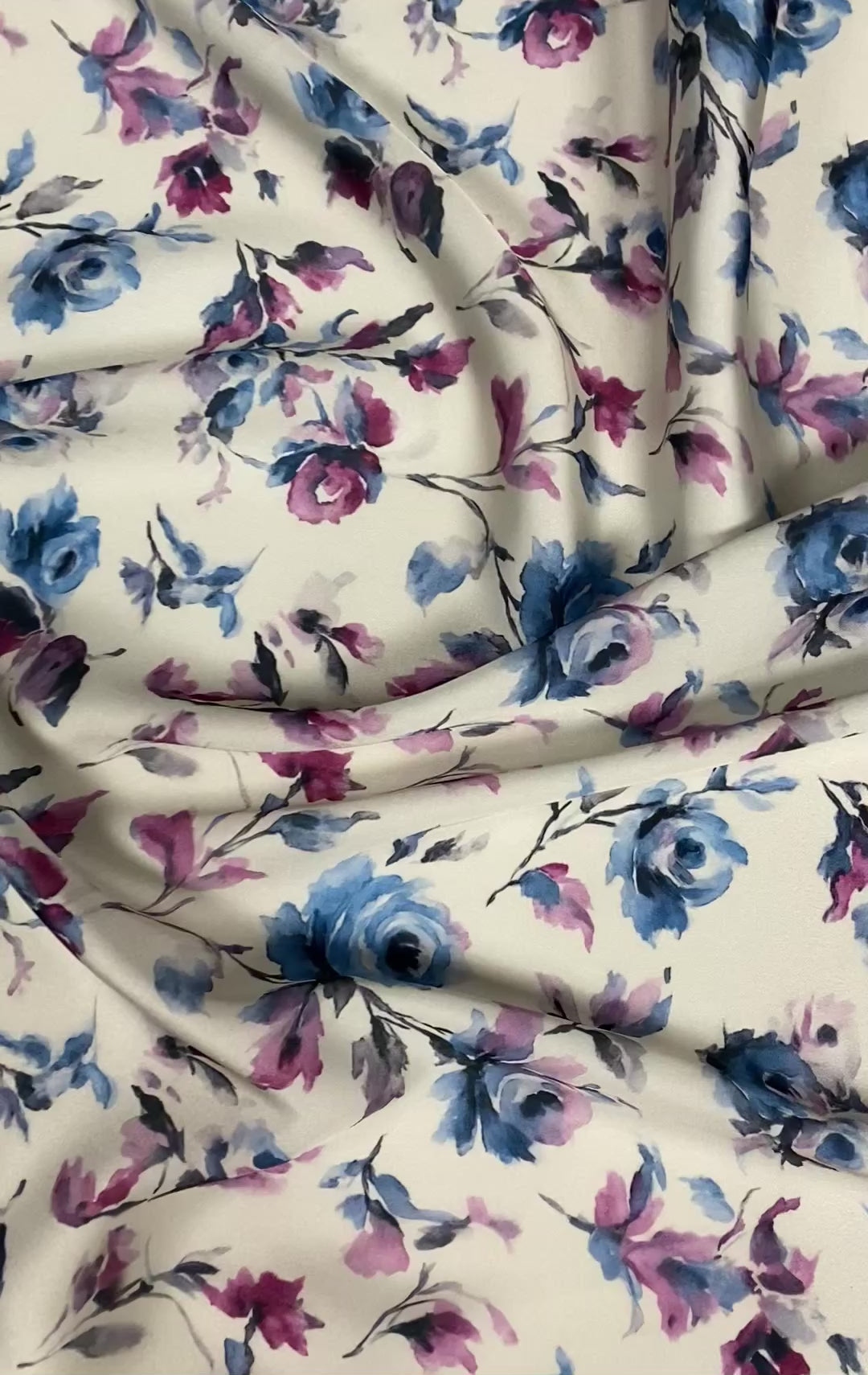 Soft cream fabric with blue and purple watercolor roses. Perfect for elegant dresses, blouses, or romantic home decor projects.