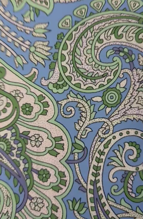 Soft blue paisley print fabric with green and cream details. Perfect for dresses, blouses, crafts, or elegant bohemian and vintage-inspired projects.