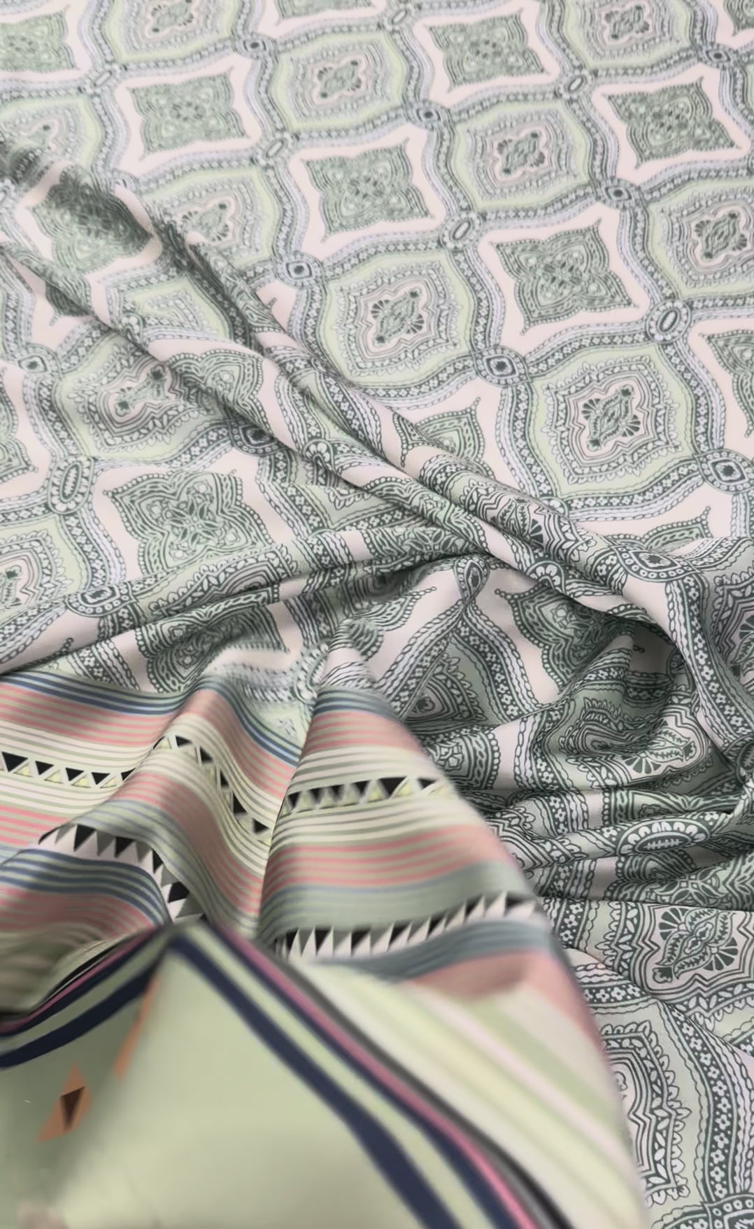 Soft Green and Pink Ethnic Pattern with Border Stripes Fabric – Custom Printed Fabric, Choose Material by Metre