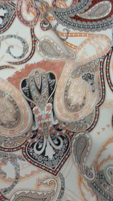 Refined paisley fabric in black, beige and red tones. Perfect for timeless dresses, blouses, or elegant home decor. Sold by the metre.