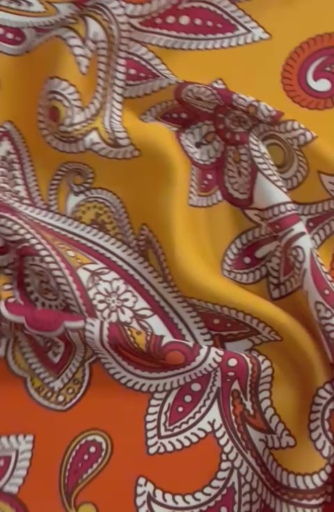 Bright paisley fabric in orange and pink shades. Perfect for summer dresses, blouses, or creative home projects. Soft texture, sold by the metre.