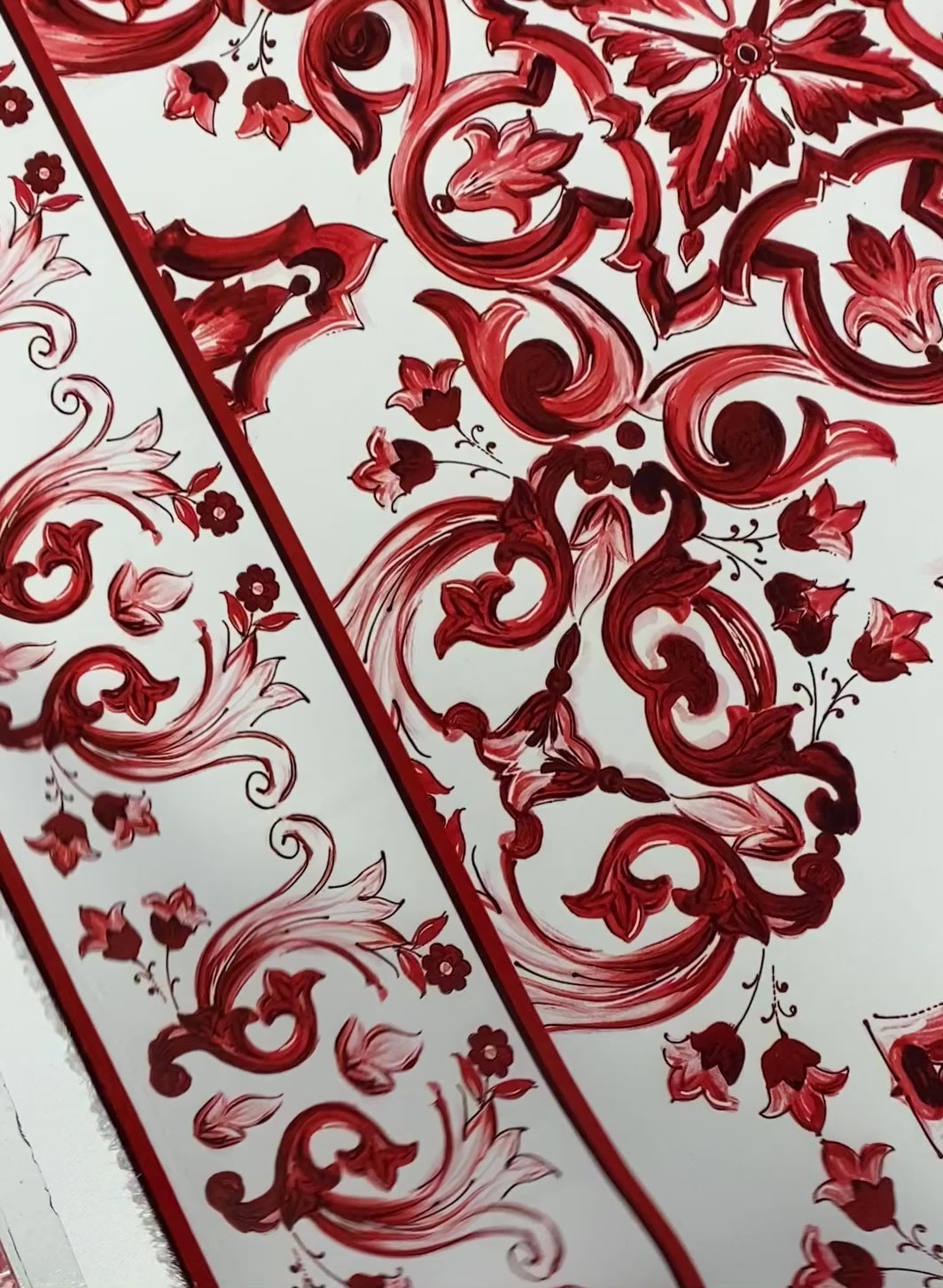 Red Sicilian Majolica Fabric – Custom Printed Fabric on Satin, Crepe, Spandex or Chiffon