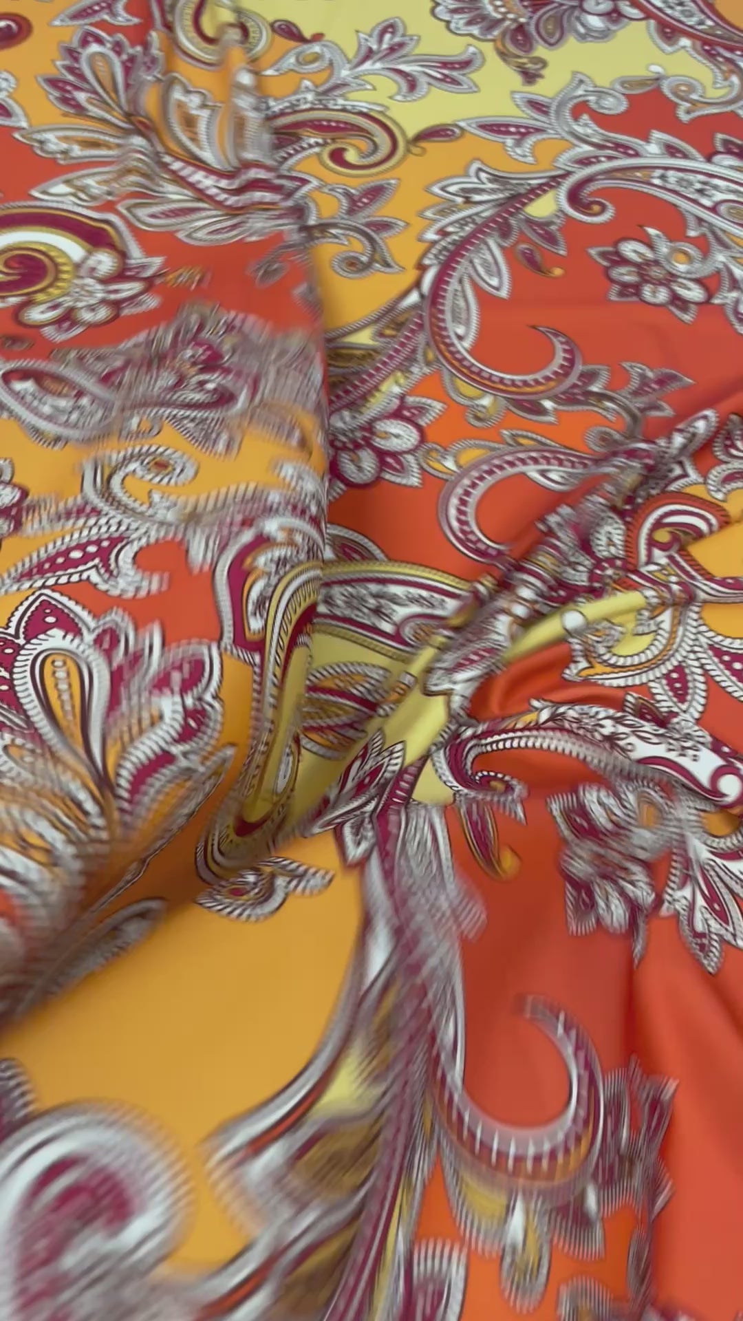 Bright paisley fabric in orange and pink shades. Perfect for summer dresses, blouses, or creative home projects. Soft texture, sold by the metre.
