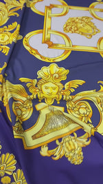 Discover crepe fabric with rich baroque gold print on deep navy. Perfect for dresses, skirts, and fashion projects. Premium quality, luxury design.