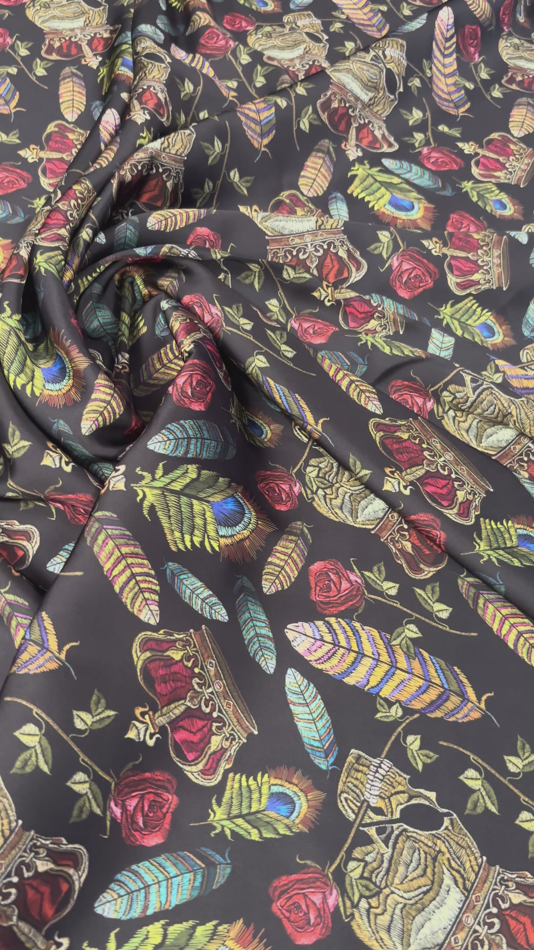 Black Chiffon Satin Fabric by the Metre – Gothic Crown Roses Feathers