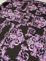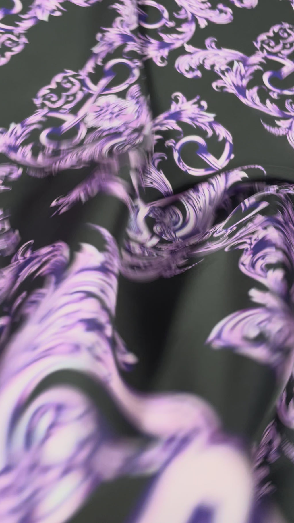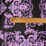 Elegant black satin fabric with ornate purple baroque print. Perfect for evening gowns, stylish blouses, costumes, and luxury sewing projects.