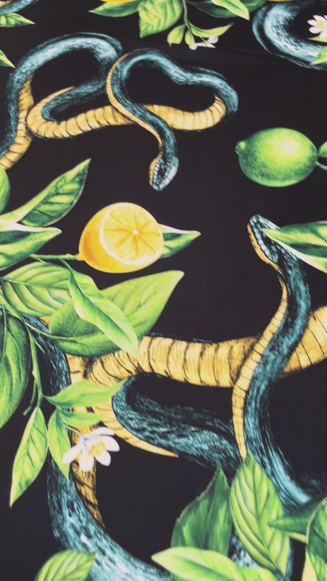 Striking black satin fabric with exotic snake and citrus fruit design. Perfect for bold dresses, statement skirts, and luxury sewing projects.