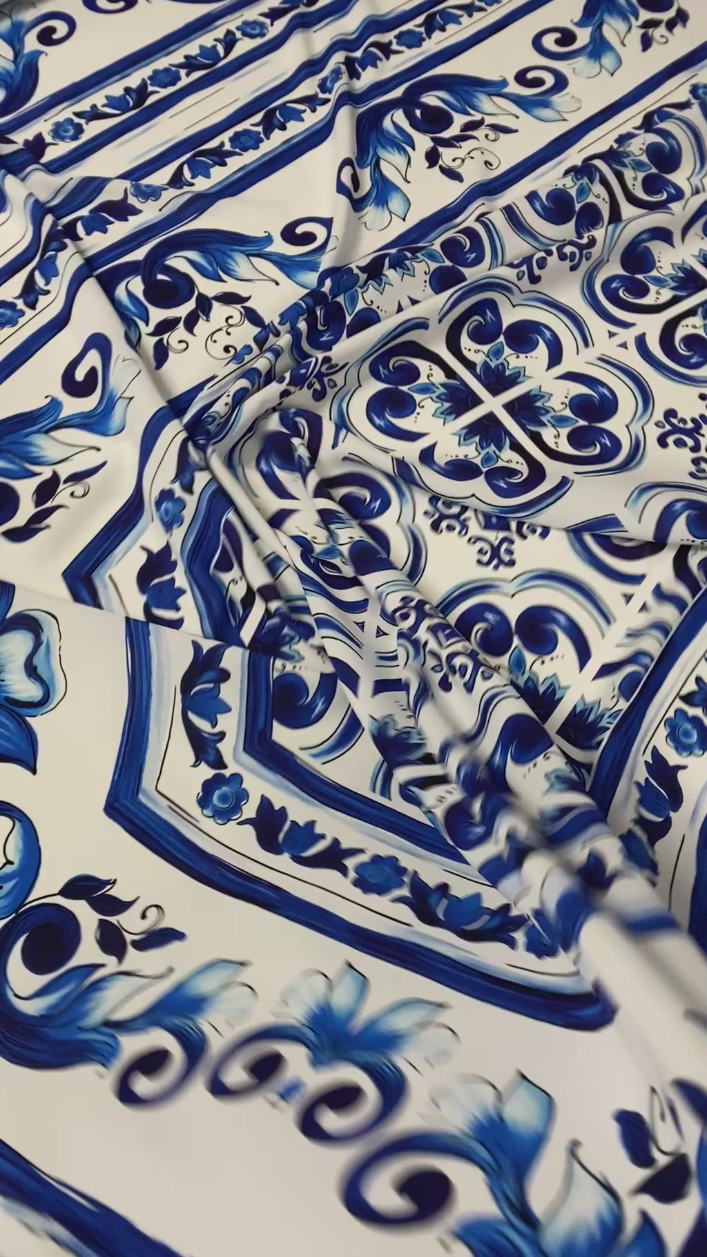 Blue Floral Tile Crepe Fabric by the Metre – White & Navy Classic