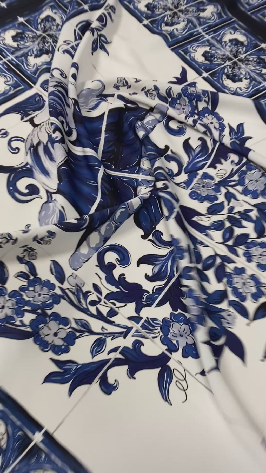 Blue & White Tile Print Crepe Fabric by the Metre. Sold by the metre, ideal for dressmaking, blouses, skirts and elegant fashion projects.