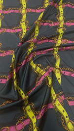 Striking chain and belt print fabric with bold graphic style. Perfect for dresses, shirts, and statement fashion projects. Sold by the metre.