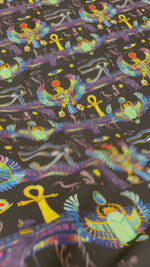 Discover crepe fabric with Egyptian symbols, Eye of Horus & hieroglyphs by the metre. Perfect for costumes, dresses & crafts. Premium quality, unique print.