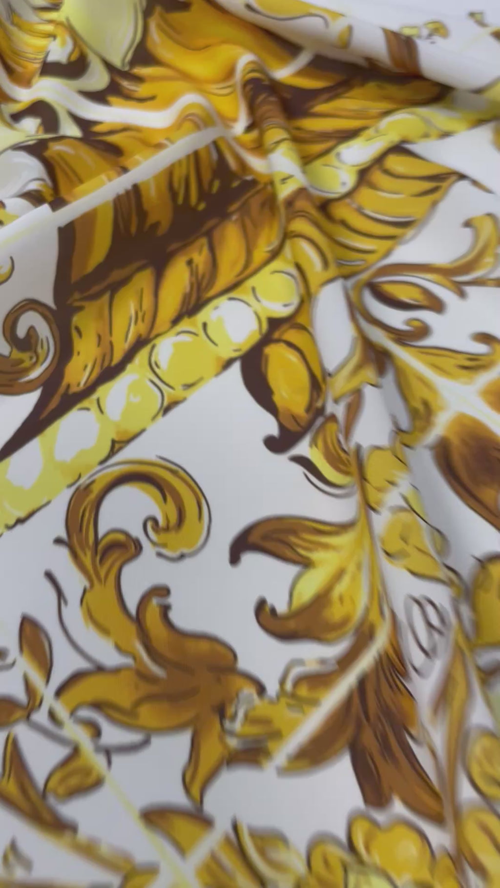 Gold Baroque Floral Crepe Fabric by the Metre. Sold by the metre, ideal for dressmaking, blouses, skirts and elegant fashion projects.