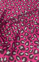 Striking hot pink leopard print fabric with bold animal pattern. Ideal for dresses, tops, and statement fashion pieces. Sold by the metre.